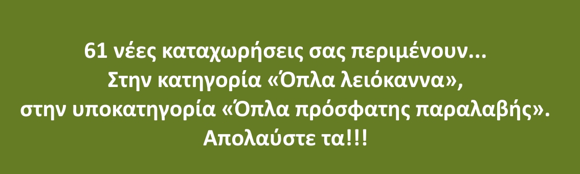 Στο site μας φωτογραφίζονται και παρουσιάζονται όλες οι καινούργιες παραλαβές προϊόντων που φθάνουν στο κατάστημά μας. Αυτό γίνεται στο συντομότερο δυνατό διάστημα από την παραλαβή, δυστυχώς όμως όχι αυθημερόν. Η φωτογράφηση και η παρουσίαση των αντικειμένων απαιτεί αρκετό χρόνο. Γι’ αυτό μπορείτε αν θέλετε να μας παραγγείλετε τηλεφωνικά το αίτημά σας να ενημερώνεστε άμεσα για κάθε νέα άφιξη, μέσω e-mail. Έτσι θα ενημερώνεστε έγκαιρα. Πολλά ενδιαφέροντα όπλα και άλλα συλλεκτικά αντικείμενα πουλήθηκαν σε πελάτες που τα είδαν συμπτωματικά στο κατάστημά μας πριν προλάβουμε να τα φωτογραφίσουμε και να τα παρουσιάσουμε στο site μας.