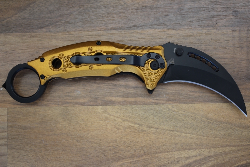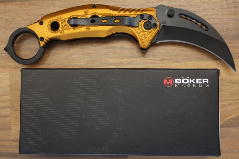 μεγέθους, σχεδιασμένος για γρήγορο χειρισμό με το ένα χέρι. Η λάμα του είναι κυρτή, με την κόψη εσωτερικά, στο σχέδιο λάμας «νύχι του δράκου», από ανοξείδωτο ατσάλι 440Α, με μαύρη αντιθαμβωτική βαφή, μήκους 74 χιλιοστών. Η λαβή του σουγιά είναι μεταλλική, με οπές μείωσης βάρους, αποσυναρμολογούμενη με τορκς, με μεταλλικό κλιπ προσάρτησης στην ζώνη και με «δαχτυλίδι» στο πίσω μέρος. Ο μηχανισμός ασφάλισης της λάμας είναι τύπου liner lock. Το συνολικό μήκος του σουγιά (ανοιχτού) είναι 205 χιλιοστά. Το βάρος του είναι 201 γραμμάρια. Προσφέρεται σε χάρτινο κουτί του κατασκευαστή κατάλληλο για συσκευασία δώρου. Λεπτομέρειες μπορείτε να δείτε στις φωτογραφίες της Αναλυτικής Παρουσίασης.