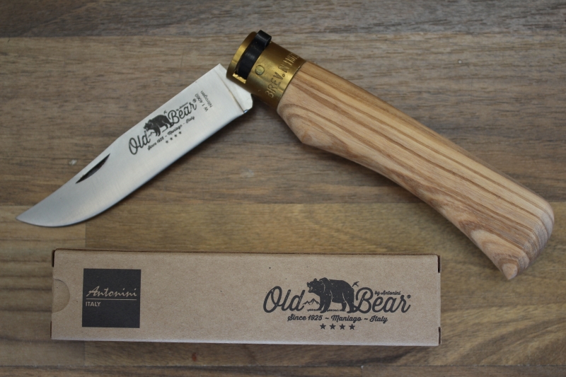 BearOlive X-Large, γενικής χρήσης. Οι σουγιάδες της σειράς Old Bear, με το επαναστατικό περιστροφικό κλείδωμα λάμας, αποτελούν ευρεσιτεχνία της ιστορικής εταιρείας μαχαιριών Antonini, που κατατέθηκε το 2015 στα 90α γενέθλια της εταιρείας (έτος ίδρυσης 1925). Η λάμα του είναι από ανοξείδωτο ατσάλι 420, μήκους 100 χιλιοστών. Η λαβή του είναι από ξύλο ελιάς. Το συνολικό μήκος του σουγιά (ανοιχτού) είναι 225 χιλιοστά. Το βάρος του είναι περίπου 83 γραμμάρια. Προσφέρεται σε χάρτινο κουτί του κατασκευαστή, με το λογότυπο της σειράς Old Bear. Λεπτομέρειες μπορείτε να δείτε στις φωτογραφίες της Αναλυτικής Παρουσίασης.