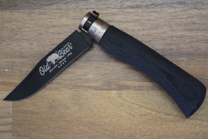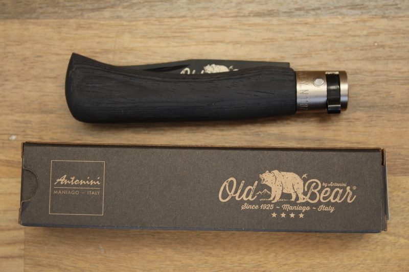 Αυθεντικός σουγιάς Antonini Old Bear Medium, γενικής χρήσης. Οι σουγιάδες της σειράς Old Bear, με το επαναστατικό περιστροφικό κλείδωμα λάμας, αποτελούν ευρεσιτεχνία της ιστορικής εταιρείας μαχαιριών Antonini, που κατατέθηκε το 2015 στα 90α γενέθλια της εταιρείας (έτος ίδρυσης 1925). Η λάμα του είναι  από ανοξείδωτο ατσάλι W1.4060, μήκους 80 χιλιοστών. Η λαβή του είναι από ελαφρύ ξύλο εμποτισμένο σε μαύρο χρώμα. Λάμα, κουμπί ασφάλισης και πρόσθιο μεταλλικό δαχτυλίδι λαβής έχουν μαύρη μεταλλική επένδυση. Το συνολικό μήκος του σουγιά (ανοιχτού) είναι 190 χιλιοστά. Το βάρος του είναι περίπου 39 γραμμάρια. Προσφέρεται σε χάρτινο κουτί του κατασκευαστή, με το λογότυπο της σειράς Old Bear. Λεπτομέρειες μπορείτε να δείτε στις φωτογραφίες της Αναλυτικής Παρουσίασης.