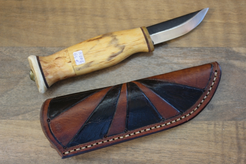 κυνηγετικό μαχαίρι Puko. Η λάμα του είναι από ατσάλι άνθρακος, τύπου Brut De Forge, μήκους 60 χιλιοστών. Η λαβή του είναι από ξύλο σημύδας με οπίσθιο μέρος από κέρατο τάρανδου, πρόσθιο μέρος από ορείχαλκο και ενδιάμεσους αντικραδασμικούς δίσκους από δέρμα. Το συνολικό μήκος του μαχαιριού είναι 170 χιλιοστά. Το βάρος του είναι 68 γραμμάρια. Συνοδεύεται από απολύτως χειροποίητη, άκρως ποιοτική δερμάτινη θήκη. Λεπτομέρειες μπορείτε να δείτε στις φωτογραφίες της Αναλυτικής Παρουσίασης.