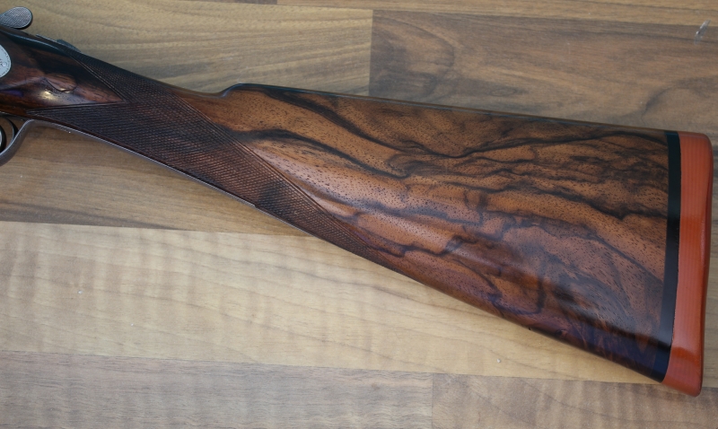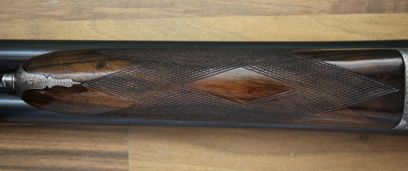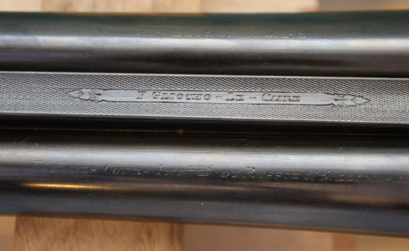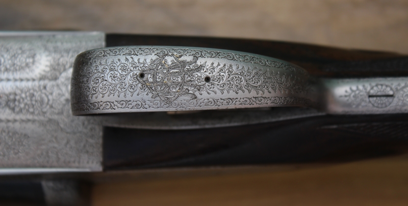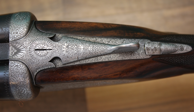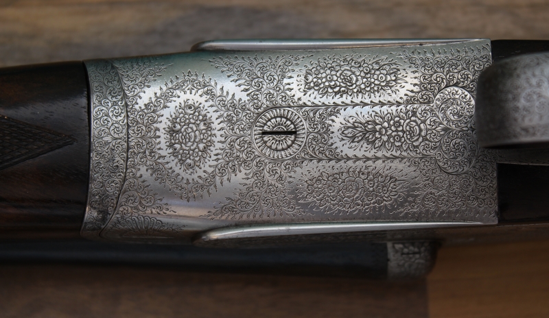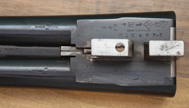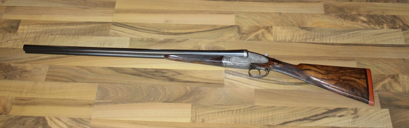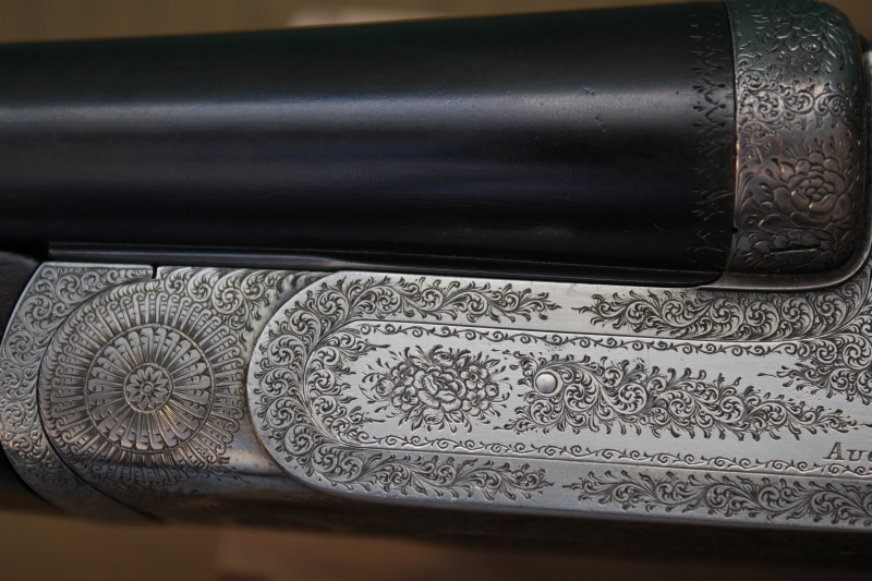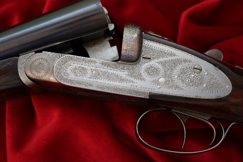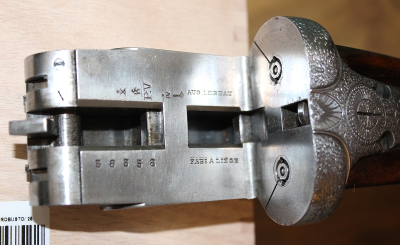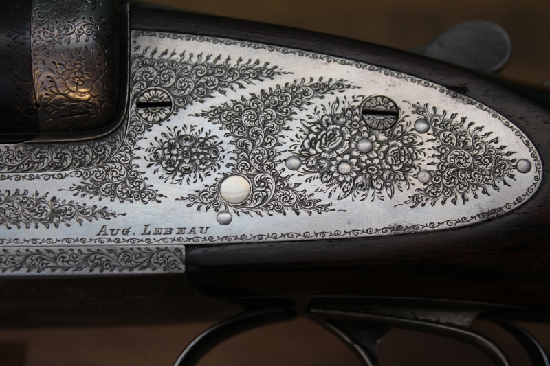 Auguste Lebeauπλαγιόκαννo δίκαννο περιστεροβολίας, κατασκευασμένο στo Βέλγιο, διαμετρήματος 12, δισκάνδαλο, με ολόκληρες φωτιές, με αυτομάτους εξολκείς, με κάννες ικανότατου πάχους με σύνδεση τύπου ντεμιμπλόκ μήκους 75 εκατοστών, με θαλάμες μήκους 70 χιλιοστών, με διάμετρο αυλών 18,7 χιλιοστών στην δεξιά και 18,6 χιλιοστών στην αριστερή (ενώ αναγράφει 18,5 στις κάννες, οπότε δεν μπορούμε να αποκλείσουμε να έχει υποστεί κάποια εσωτερική λείανση – honing μικρού βαθμού) και με συσφίξεις 3/4 και ανοιχτό full (** & * – 7/10 & 9/10). Κοντάκι αγγλέ με ξύλο πολύ ψηλής βαθμίδας, από καρυδιά Πυρηναίων, με διχτυωτά νερά, με επάνω απολήξεις (overhorns) που εφάπτονται στα fences του όπλου (stocked to the fences) στα πρότυπα των υψηλότερης βαθμίδας πλαγιόκαννων, με αυθεντικό αγγλικό ελαστικό πέλμα τύπου silver pad, συνολικού μήκους 36 εκατοστών. Ισοϋψής γέφυρα στην μπάσκουλα, ράγες εκτόνωσης στον καθρέφτη της, κρυφό τρίτο κλειδί, κορυφαίο σκάλισμα που διατηρεί πλήρως την οξύτητά του και ένα τεράστιο όνομα συνθέτουν ένα συγκλονιστικό εύρημα. Το βάρος του όπλου είναι 3.355 γραμμάρια.