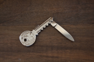 ιταλικός σουγιάς, σε σχήμα κλειδιού. Η λάμα του σουγιά έχει μήκος μόλις 40 χιλιοστών και πάχος 1,8 χιλιοστών. Είναι κατασκευασμένη από άγνωστης ποιότητας και προδιαγραφών ατσάλι και δεν διαθέτει μηχανισμό κλειδώματος. Το βάρος του σουγιά είναι μόλις 20 γραμμάρια. Δεν συνοδεύεται από κουτί συσκευασίας. Παρόλ’ αυτά θεωρούμε ότι αποτελεί οικονομικό και εντυπωσιακό δώρο. Λεπτομέρειες μπορείτε να δείτε στην φωτογραφία της Αναλυτικής Παρουσίασης.
