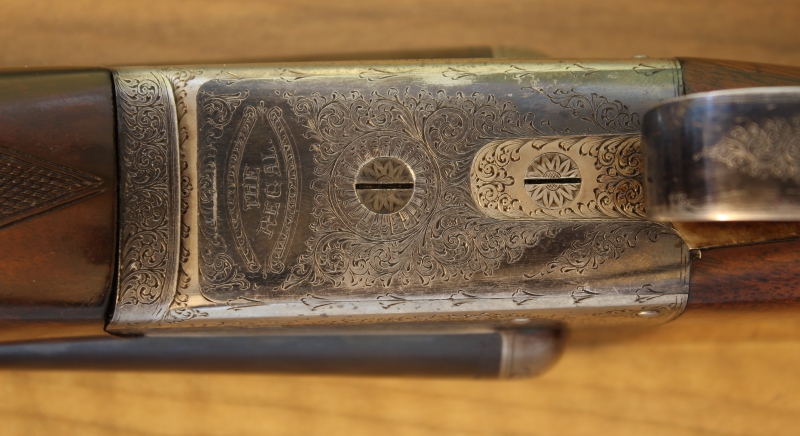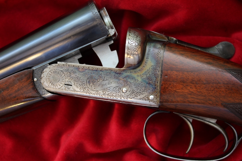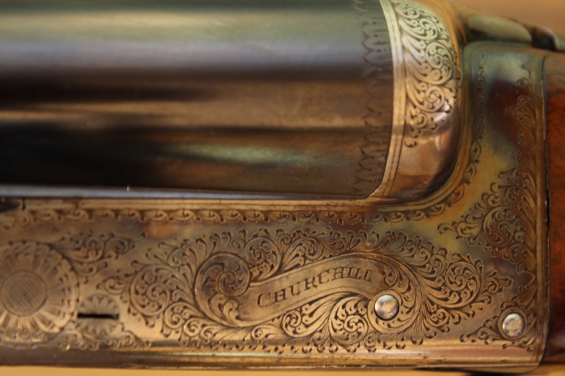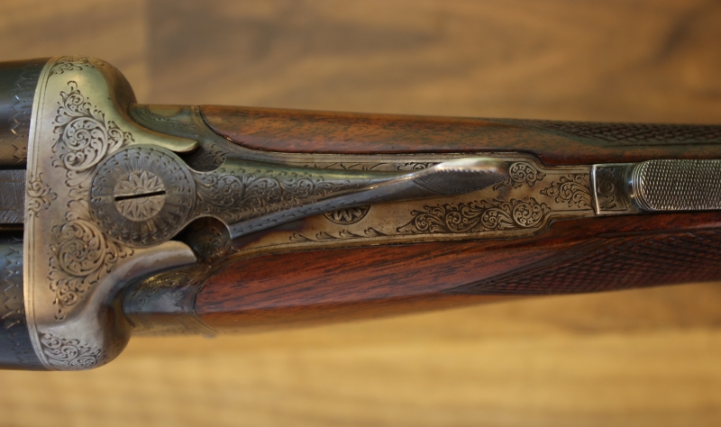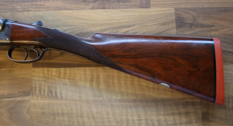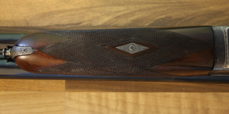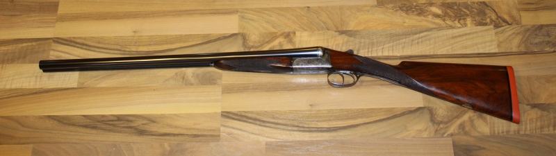 πανέμορφο λονδρέζικο πλαγιόκαννο δίκαννο κατασκευασμένο το 1971, διαμετρήματος 12, με μισές φωτιές, με αυτομάτους εξολκείς, με κάννες μήκους 63,5 εκατοστών (25 ιντσών), με ρίγα τύπου Churchill, με διάμετρο αυλών 18,5 χιλιοστών (εκ κατασκευής), με θαλάμες μήκους 70 χιλιοστών (εκ κατασκευής και όχι εκ μετατροπής) και συσφίξεις βελτιωμένο κύλινδρο και ντεμί (**** & *** – 2,5/10 & 4,5/10). Κοντάκι αγγλέ με χρυσό οβάλ που φέρει τα αρχικά ΑΑ, με εντονότατη απόκλιση (cast off) για δεξιόχειρα, με πορτοκαλί πέλμα αγγλικού τύπου, συνολικού μήκους 37,6 εκατοστών. Το βάρος του όπλου είναι 2.895 γραμμάρια.