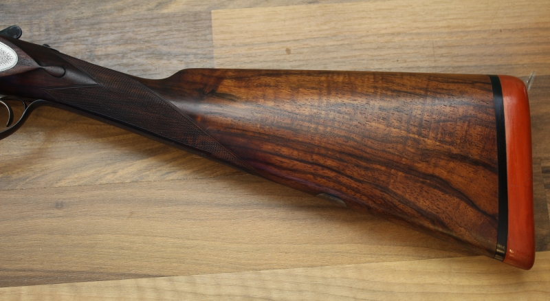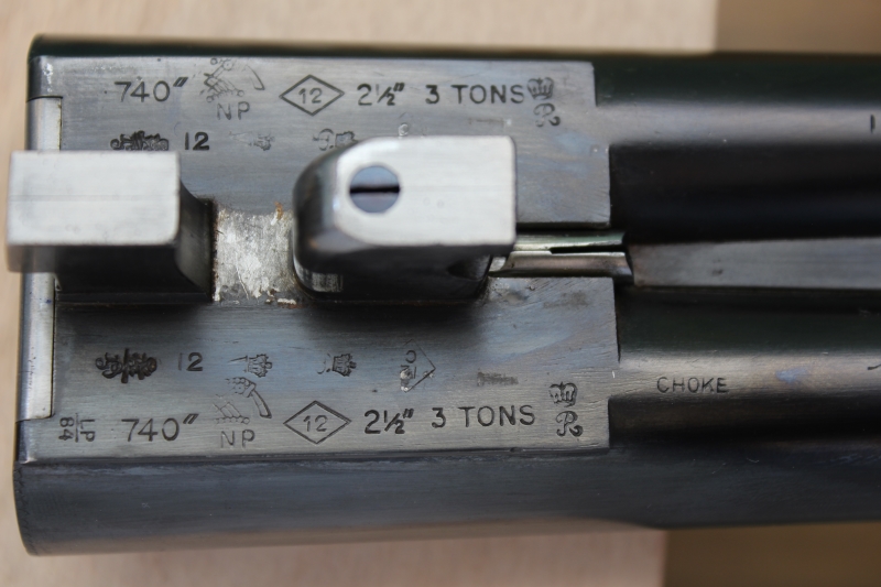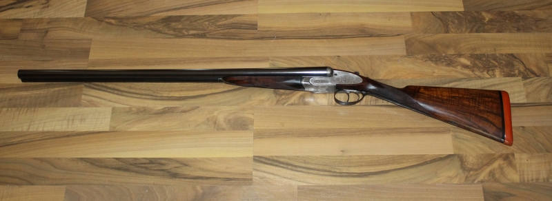 πλαγιόκαννο δίκαννο, κατασκευασμένο στο Λονδίνο το 1906, διαμετρήματος 12, δισκάνδαλο, με ολόκληρες φωτιές, με σύστημα αυτόματου ανοίγματος (self opener), με αυτομάτους εξολκείς, με κάννες τύπου ντεμιμπλόκ μήκους 73,5 εκατοστών (29 ιντσών), με διάμετρο αυλών 18,6 χιλιοστών (με δοκιμασία στην αγγλική τράπεζα δοκιμών για 18,8 – 0,740 της ίντσας), με θαλάμες μήκους 65 χιλιοστών και συσφίξεις κύλινδρο και σφιχτό ντεμί (***** & *** – 0/10 & 6/10). Κοντάκι αγγλέ με δάκρυ και άνω πρόσθιες απολήξεις (overhorns) που εφάπτονται στα fences (stocked to the fences), με πέλμα αγγλικό silver pad συνολικού μήκους 36,9 εκατοστών.