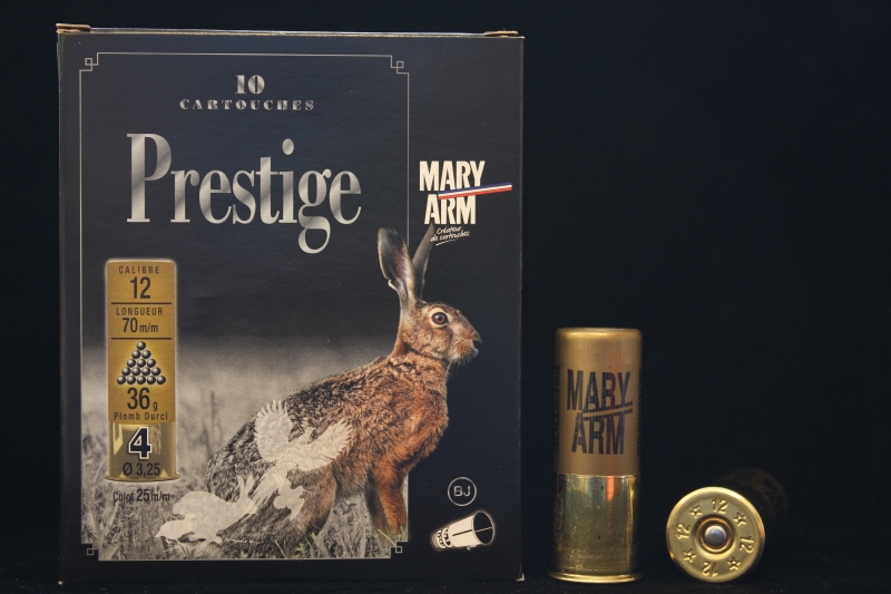 Η εταιρεία Mary Arm σχεδίασε και διατηρεί τη σειρά φυσιγγίων Prestige, ως μία από τις πιο μελετημένες γομώσεις της, εξειδικευμένες για συγκεκριμένα είδη θηραμάτων. Το Mary Arm Prestige για το κυνήγι του λαγού κυκλοφορεί με 36 γραμμάρια σκάγια Νο4, υψηλής περιεκτικότητας σε αντιμόνιο, με συγκεντρωτήρα. Η πολύ καλή κατανομή του σε συνδυασμό με το βάρος γόμωσής του σε σκάγια, του προσφέρουν εξαιρετικά αποτελέσματα σε οριακές αποστάσεις.