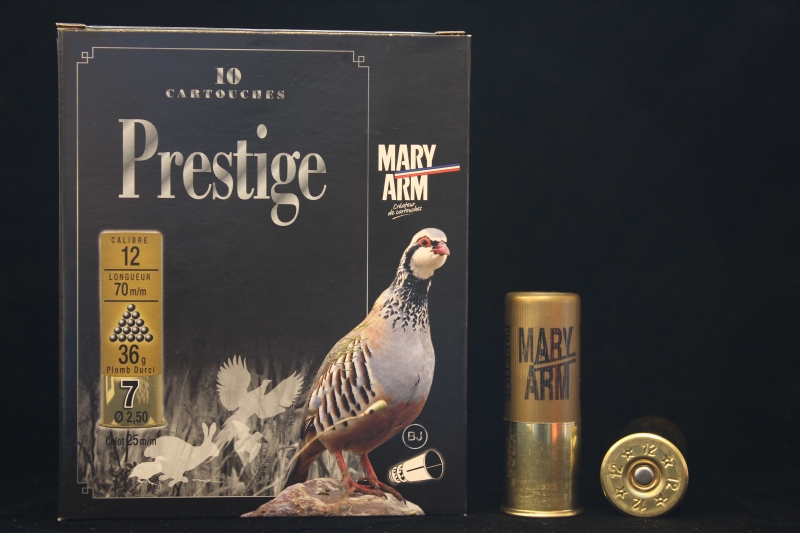 Η εταιρεία Mary Arm σχεδίασε και διατηρεί τη σειρά φυσιγγίων Prestige, ως μία από τις πιο μελετημένες γομώσεις της, εξειδικευμένες για συγκεκριμένα είδη θηραμάτων. Το Mary Arm Prestige για το κυνήγι της πέρδικας κυκλοφορεί με 36 γραμμάρια σκάγια Νο7, υψηλής περιεκτικότητας σε αντιμόνιο, με συγκεντρωτήρα. Η πολύ καλή κατανομή του σε συνδυασμό με το βάρος γόμωσής του σε σκάγια, του προσφέρουν εξαιρετικά αποτελέσματα σε οριακές αποστάσεις, χωρίς να «συγχωρούν» λάθη στις πολύ κοντινές αποστάσεις.